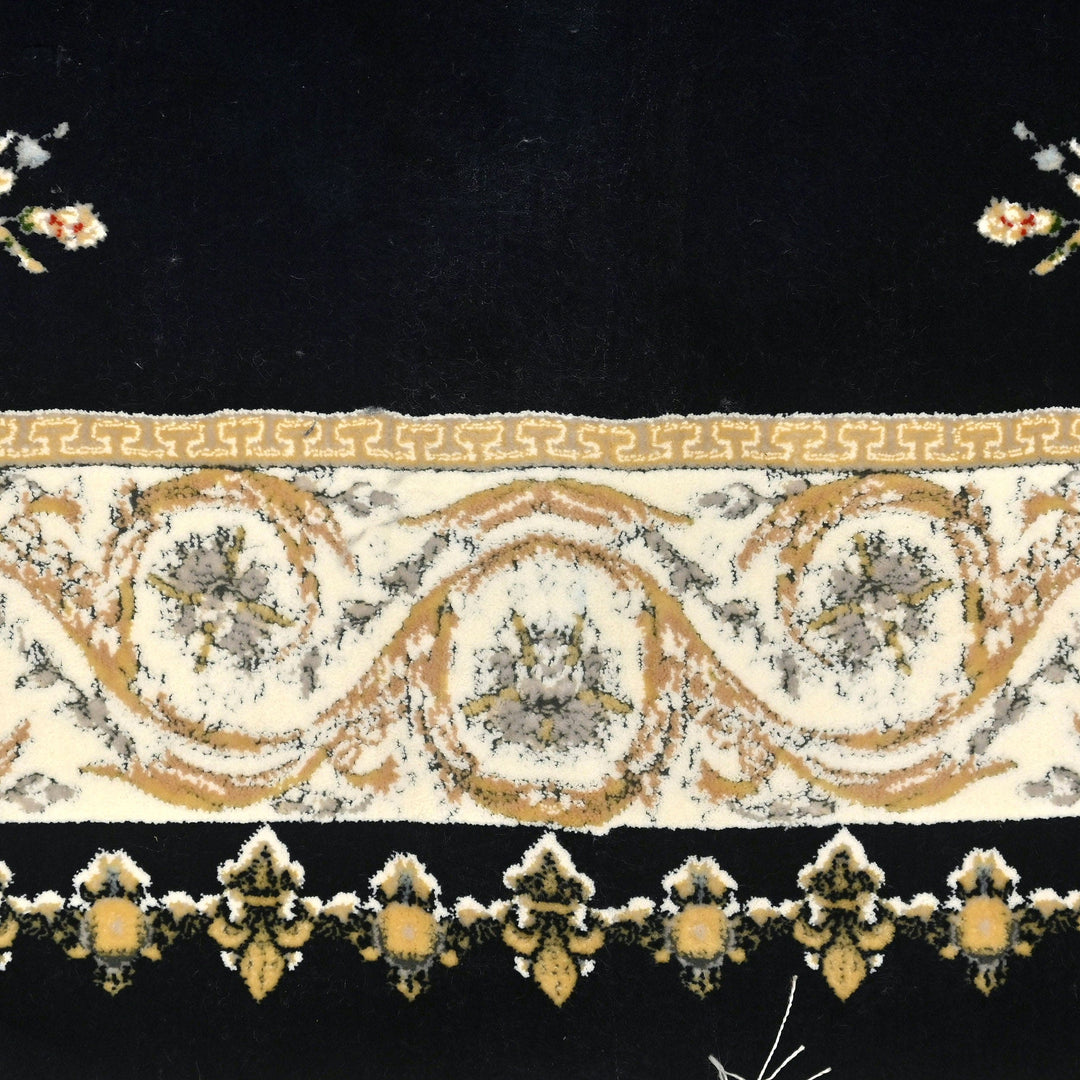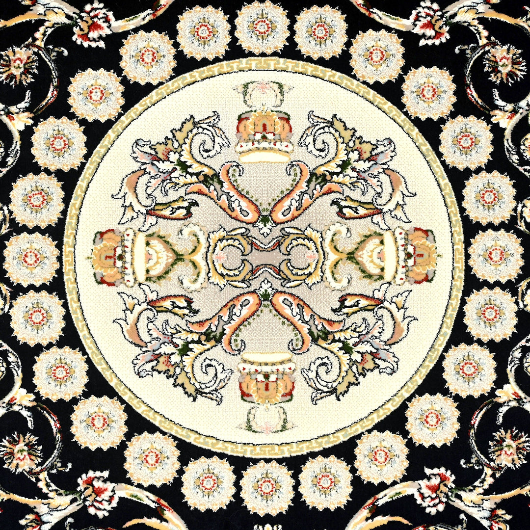 This elegant Persian rug showcases a luxurious gold and black color palette, with intricate floral motifs that exude sophistication and timeless charm. The rich gold patterns stand out beautifully against the deep black background, creating a striking visual contrast that makes the rug a captivating centerpiece for any room.