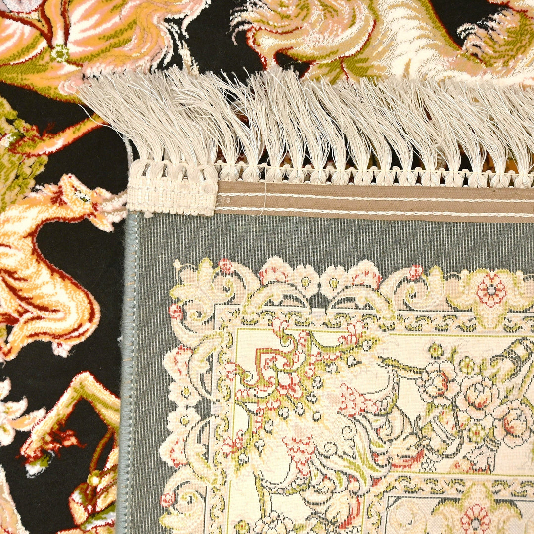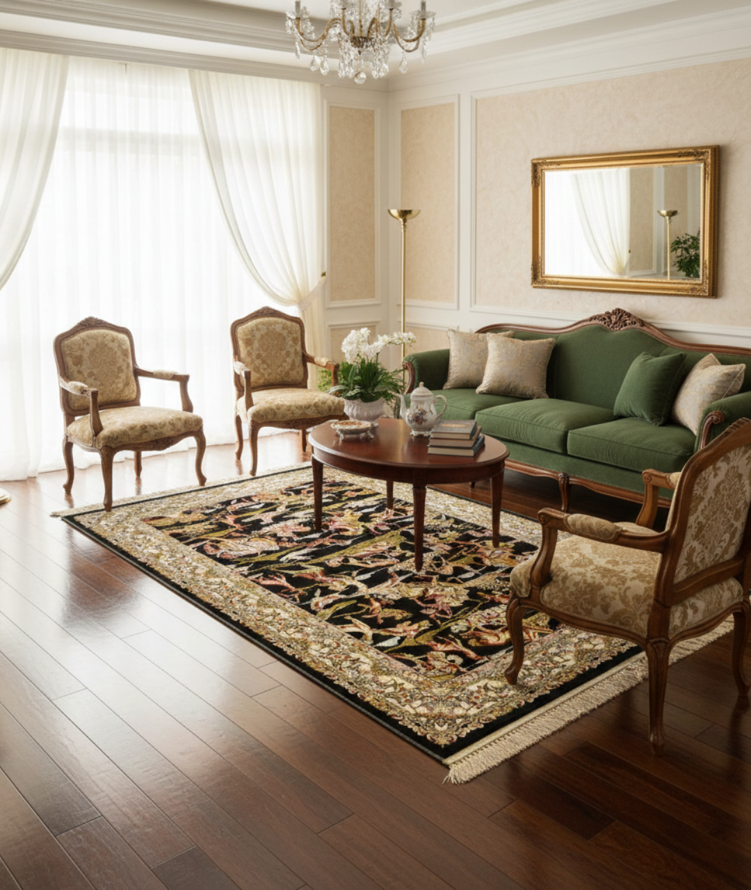 The Sultani Rug in a striking combination of gold and black exudes luxury and sophistication. Its intricate patterns shimmer in gold against a deep black background, creating a bold and elegant centerpiece that elevates any room. The rich contrast highlights the rug’s detailed craftsmanship, making it perfect for both modern and classic interiors.