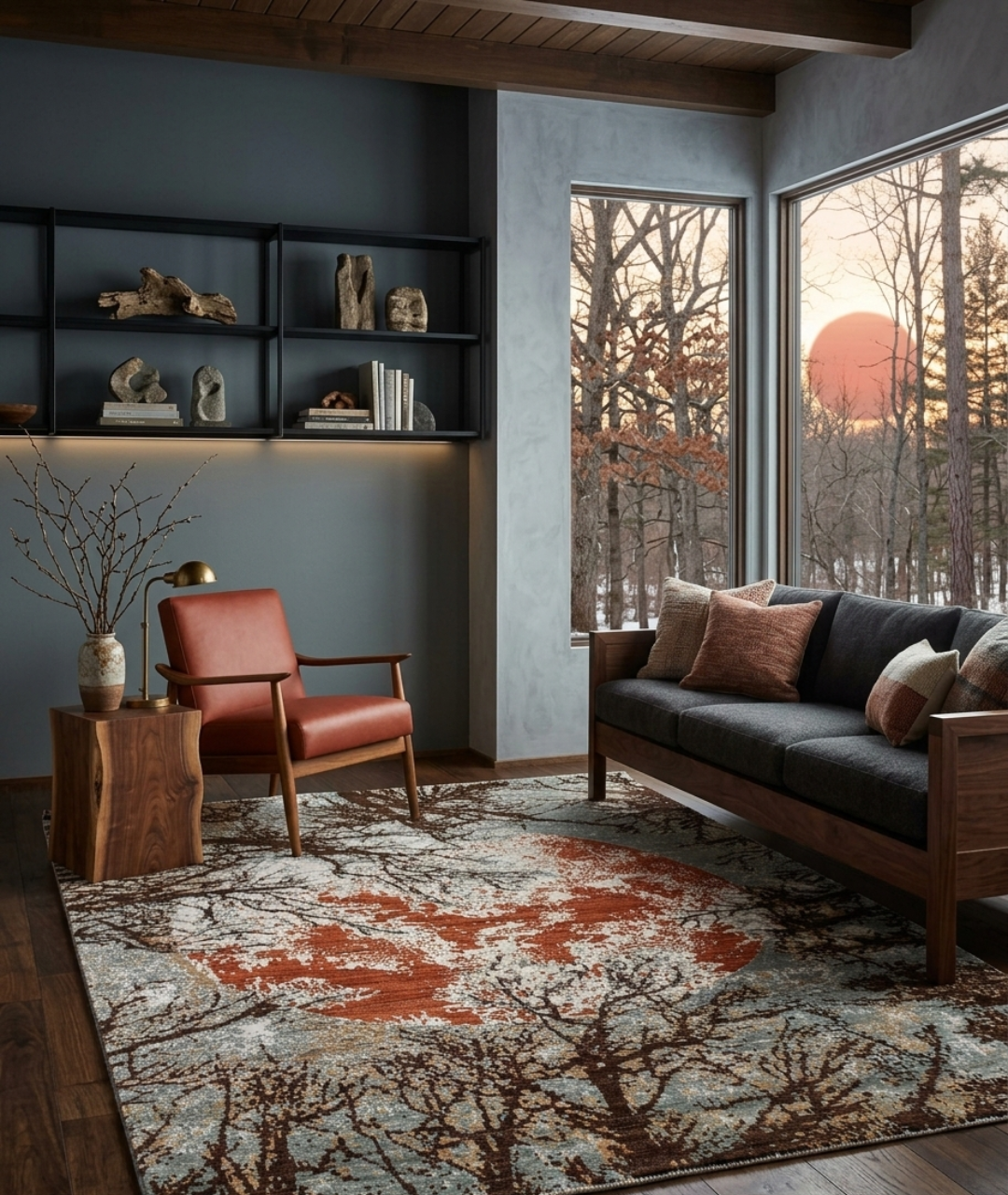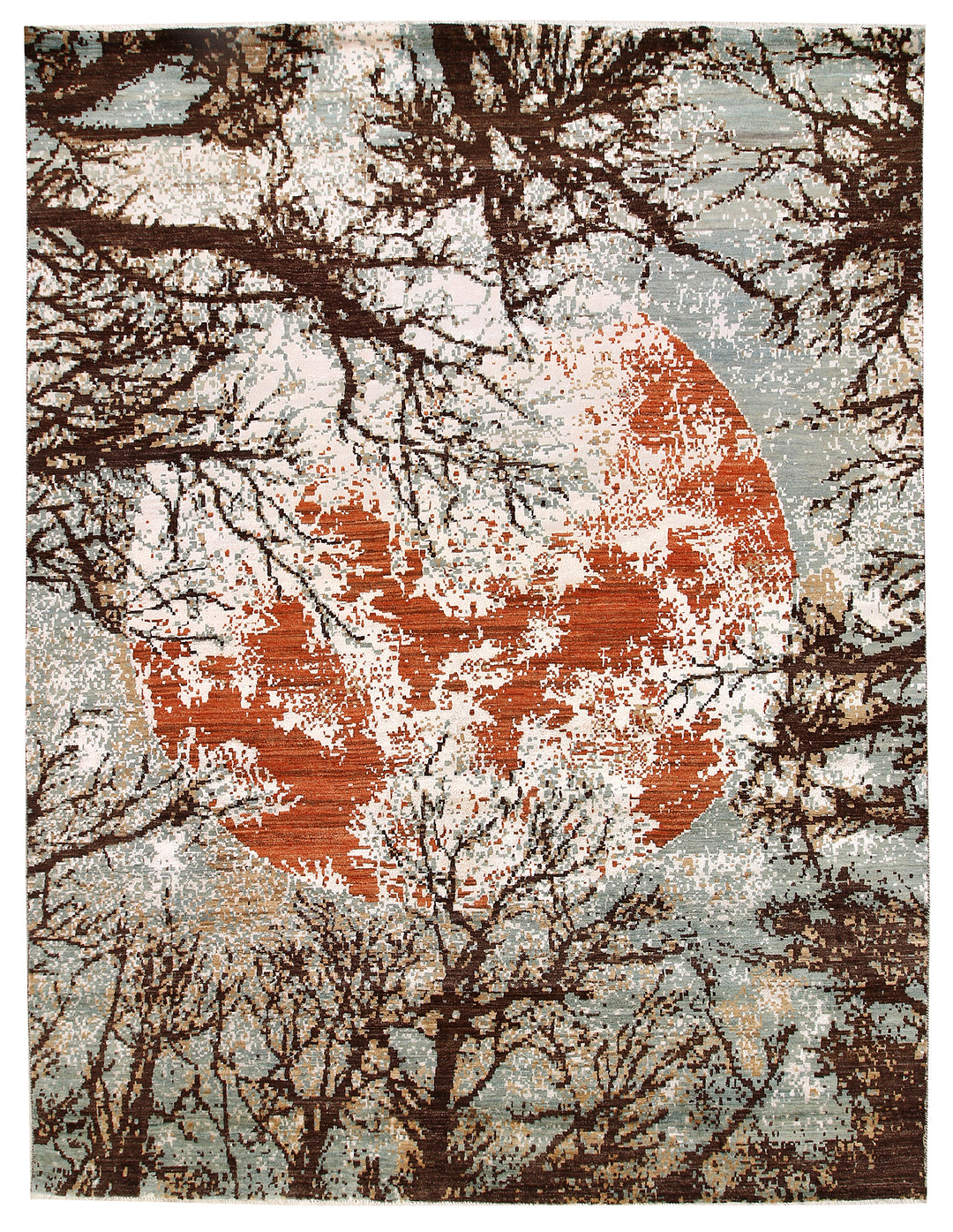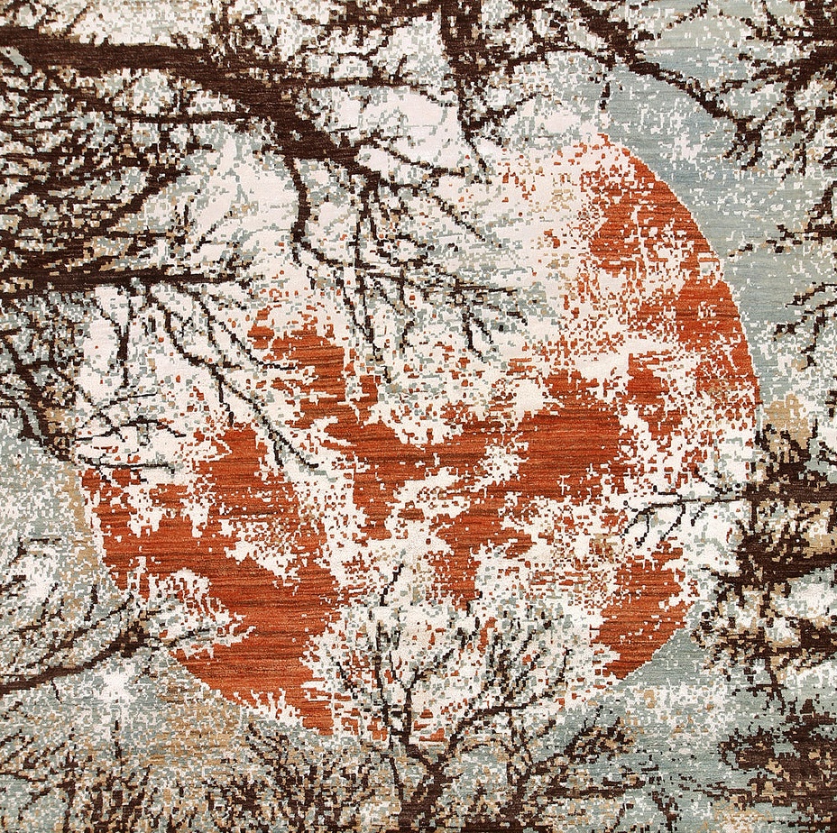 The Abstract Handmade Rug features a captivating design inspired by a serene moon surrounded by delicate tree branches. The flowing patterns and subtle contrasts create a dreamy, almost painterly effect, evoking the calm beauty of a moonlit night.
