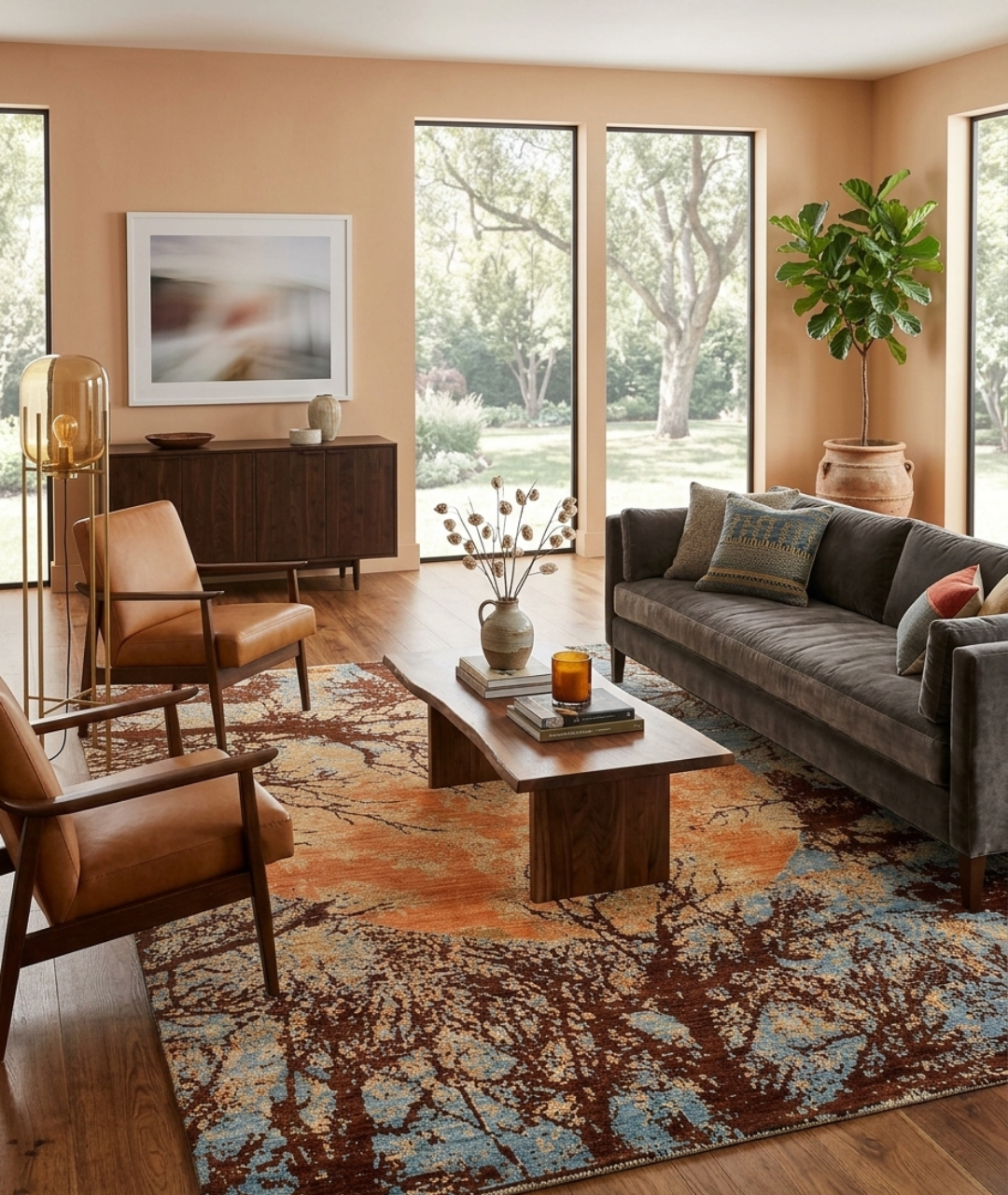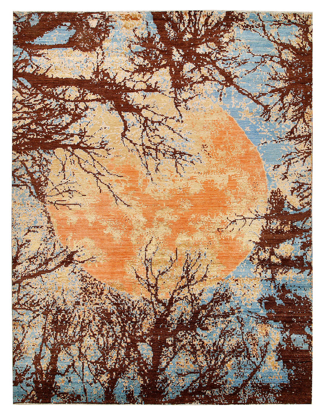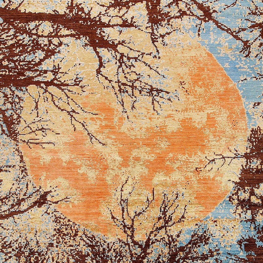 The Abstract Handmade Rug features a captivating design inspired by a serene moon surrounded by delicate tree branches. The flowing patterns and subtle contrasts create a dreamy, almost painterly effect, evoking the calm beauty of a moonlit night.