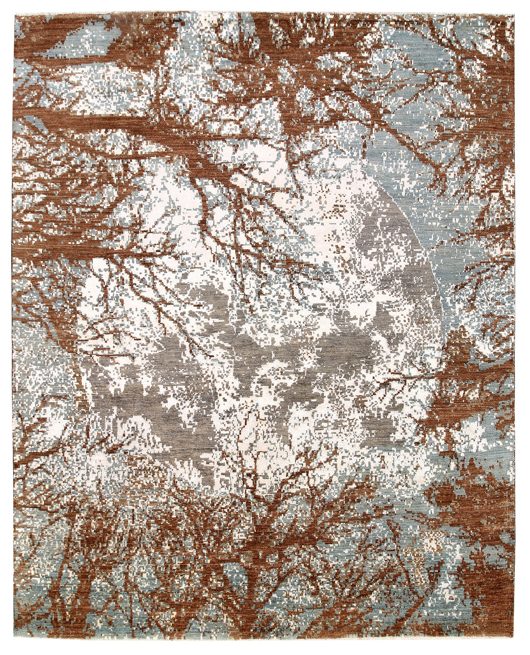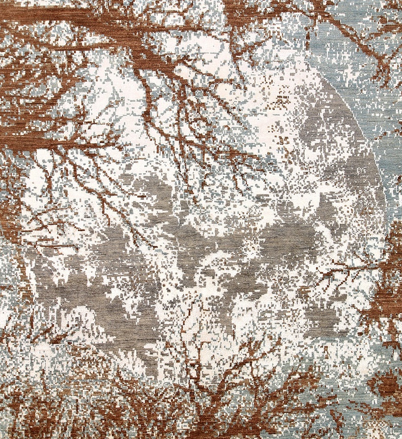 The Abstract Handmade Rug features a captivating design inspired by a serene moon surrounded by delicate tree branches. The flowing patterns and subtle contrasts create a dreamy, almost painterly effect, evoking the calm beauty of a moonlit night.