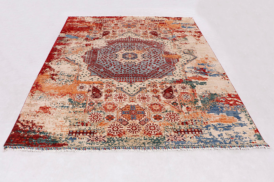 The Earse Mamluk Handmade Rug features a delicate Mamluk design in soft, soothing colors, creating an elegant and calming aesthetic. Handwoven by skilled artisans, the intricate patterns are gracefully arranged, showcasing the timeless artistry of Mamluk craftsmanship.