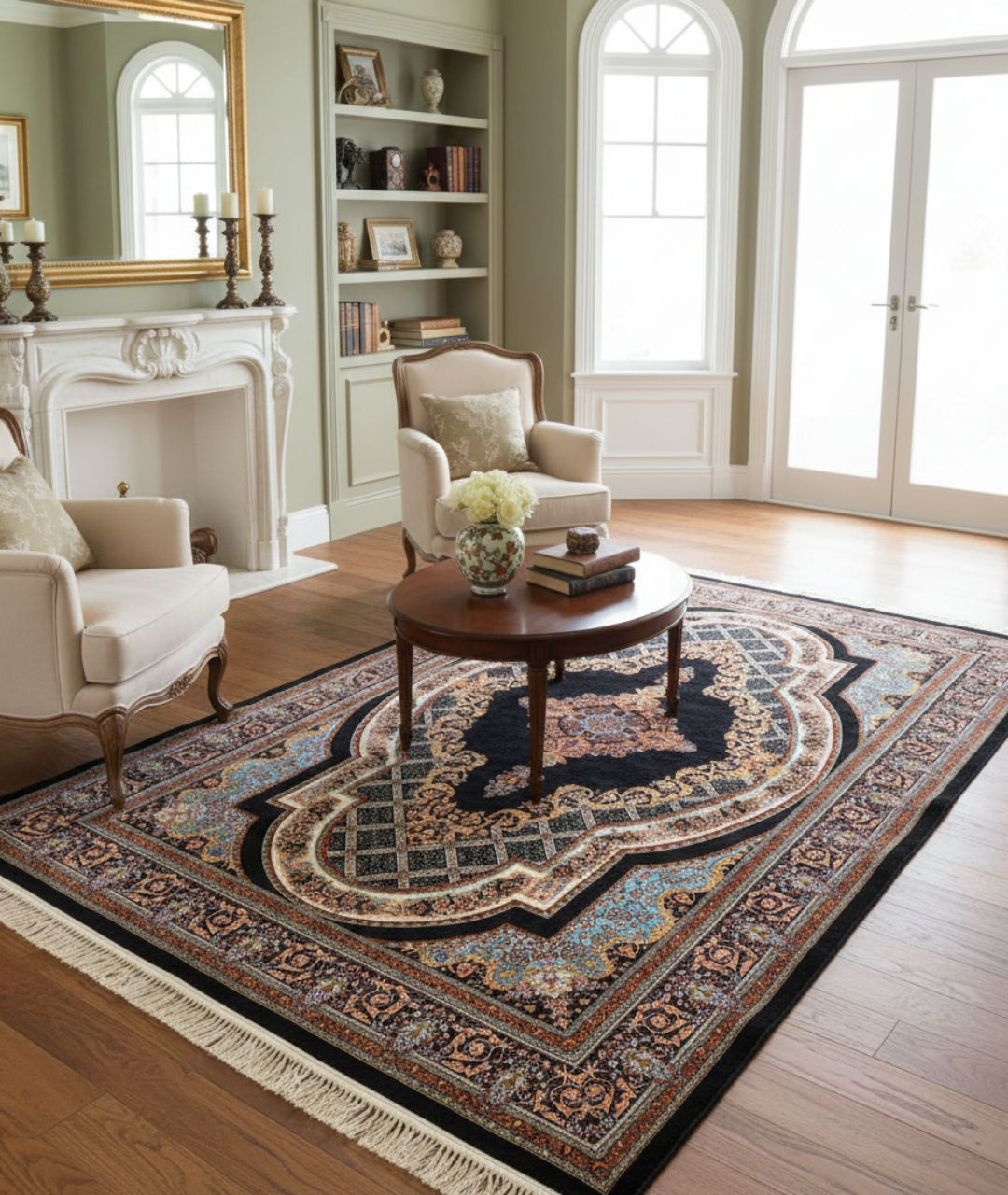 The Sultan-E-Khas Rug features a striking black-and-beige color combination, blending bold sophistication with timeless elegance. The deep black base is beautifully contrasted by intricate beige patterns, creating a harmonious balance that draws the eye and enhances any room. This versatile palette makes the rug a perfect centerpiece for both contemporary and classic interiors.